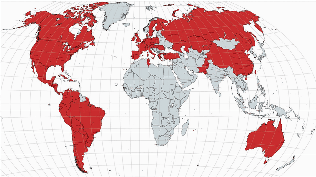Şəkil 1.  COVID-19 pandemiyası dövründə ST qalxması ilə Mİ görə hospitalizasiya məlumatları daşıyan məqalələrin coğrafi paylanması