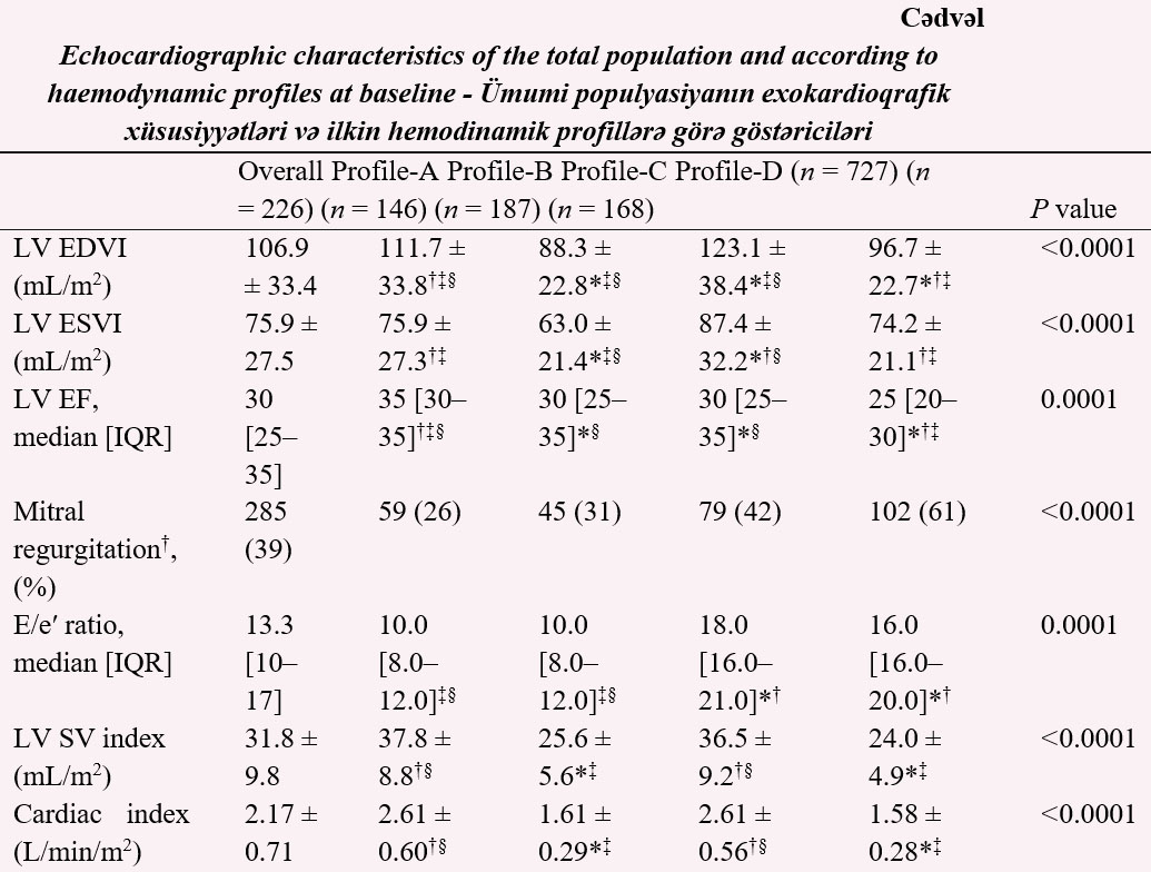 İlkin olaraq profil-A 226 (31%) pasiyent, profil-V 146 (20%) pasiyent, profil-S 187 pasiyent (26%) və profil-D 168 (23%) pasiyenti əhatə edirdi. Profil-C pasiyentləri yaşca daha yaşlı idi (P < 0,001) və, profil-D pasiyentləri ilə yanaşı anamnezdə ÜÇ görə hospitalizasiya halları daha çox idi (P = 0,001). Profil-D pasiyenlərinin sistolik AT göstəriciləri daha aşağı idi, yanaşı xəstəliklərinin sayı daha çox idi, NYHA sinifi daha yüksək idi, böyrəklərin funksiyası daha çox pozulmuşdur.