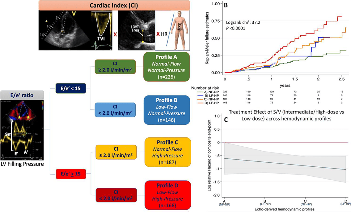 Həm orta, həm yüksək dozalarda sakubitril/valsartan S/V-terapiyasının üstünlükləri bütün exo-təyinatlı hemodinamik profillər üçün dəyişməz idi. Birbaşa axının və sol mədəciyin funksiyasının qiymətləndirilməsi müxtəlif profillərə uyğun hemodinamik fenotipləri aşkar edir; (ii) qeyri-qənaətbəxş hemodinamik profilə aid pasiyentlərdə birbaşa axın azalıb və AF-dan asılı olmayaraq proqnoz daha pisdir; (iii) yüksək E/e’ və aşağı birbaşa axınlı pasiyentlər (profil-D) arasında sakubitril/valsartan S/V tam dozalı müalicə alması ehtimalı daha azdır və bu pasiyentlər həmin terapiyanı daha tez kəsir.