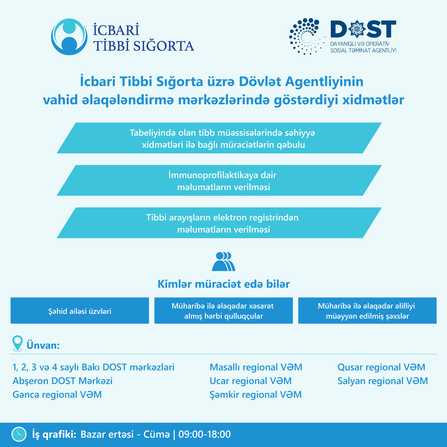 Qeyd edək ki, vahid əlaqələndirmə mərkəzləri ilk dəfə 2021-ci ilin 23 avqust tarixində Əmək və Əhalinin Sosial Müdafiəsi Nazirliyinin (Nazirlik) tabeliyindəki Dayanıqlı və Operativ Sosial Təminat Agentliyinin (DOST Agentliyi) mərkəzlərində fəaliyyətə başlayıb. Azərbaycan Respublikası Prezidentinin 2021-ci il 25 iyun tarixli Fərmanına əsasən vahid əlaqələndirmə mərkəzlərinin yaradılmasında məqsəd şəhid ailəsi üzvləri, müharibə ilə əlaqədar xəsarət almış hərbi qulluqçular və əlilliyi müəyyən edilmiş şəxslərə vahid məkandan dövlət qurumlarının təxirəsalınmaz və operativ xidmət göstərməsini təmin etməkdir.