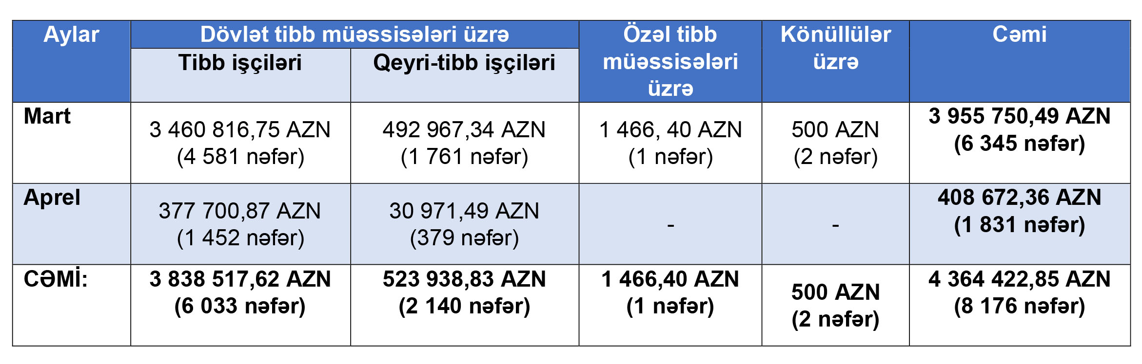 Tibb və qeyri-tibb tibb işçilərinə, eləcə də könüllülərə qeyd edilən aylar üzrə ödənilən müddətli əlavə və mükafatların məbləği aşağıdakı kimidir: