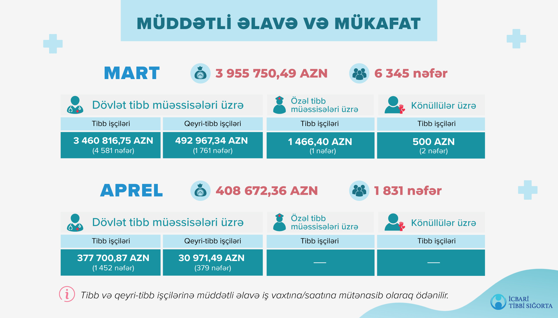 Azərbaycan Respublikası Prezidentinin müvafiq sərəncamına və Nazirlər Kabinetinin müvafiq qərar və sərəncamlarına uyğun olaraq İcbari Tibbi Sığorta üzrə Dövlət Agentliyi (Agentlik) tərəfindən 2022-ci ilin mart və aprel ayları ərzində yeni növ koronavirus infeksiyası ilə mübarizə tədbirlərində iştirak edən tibb işçilərinə iş vaxtına/saatına mütənasib olaraq təxminən 3,8 milyon manatdan artıq, qeyri-tibb işçilərinə isə 0,5 milyon manatdan çox müddətli əlavə ödənilib.