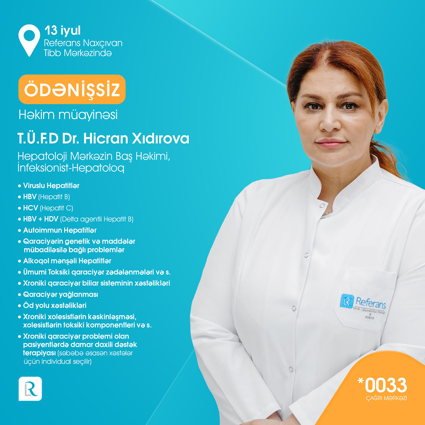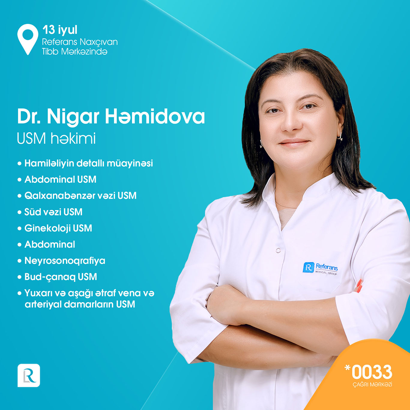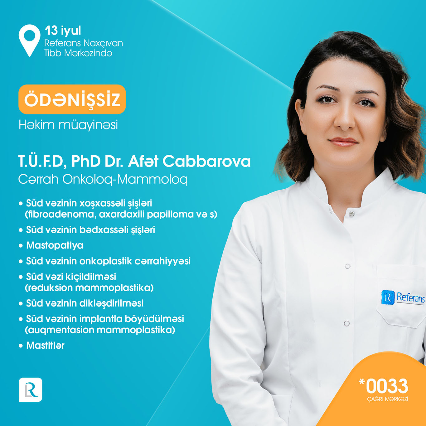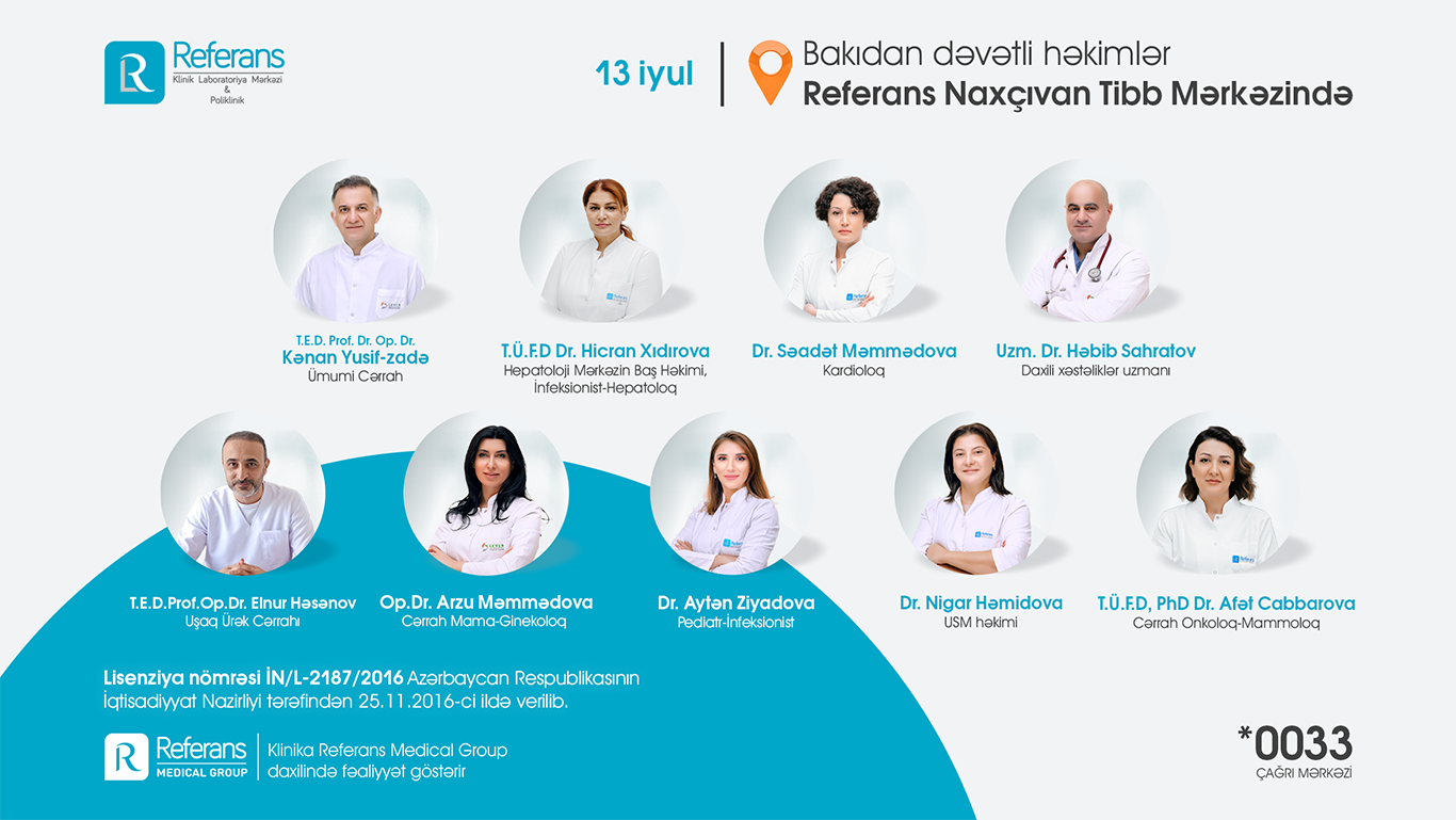 Referans Naxçıvan Tibb Mərkəzi 7000-dən çox laborator müayinələr, peşəkar həkim qəbulları, Bakıdan dəvətli həkimlər, instrumental-diaqnostik müayinələr (USM, MRT, EXO-KQ, EKQ) ilə xidmətlər göstərməkdədir. Açılışa özəl olaraq 13 iyulda Referansın Bakıdan dəvətli peşəkar həkim heyəti: ümümi cərrah-qastroentroloq professor Op. Dr. Kənan Yusif-zaadə, uşaq ürək cərrahı professor Op. Dr. Elnur Həsənov, infeksionist-hepatoloq, tibb üzrə fəlsəfə doktoru Dr. Hicran Xıdırova, daxili xəstəliklər uzmanı Dr. Həbib Sahratov, cərrah mama-ginekoloq Op. Dr. Arzu Məmmədova, pediatr-infeksionist Dr. Aytən Ziyadova, kardioloq Dr. Səadət Məmmədova usm həkimi Dr. Nigar Həmidova, cərrah mammoloq-onkoloq tibb üzrə fəlsəfə doktoru Dr. Afət Cabbarova tərəfindən ÖDƏNİŞSİZ həkim qəbulları həyata keçiriləcək.