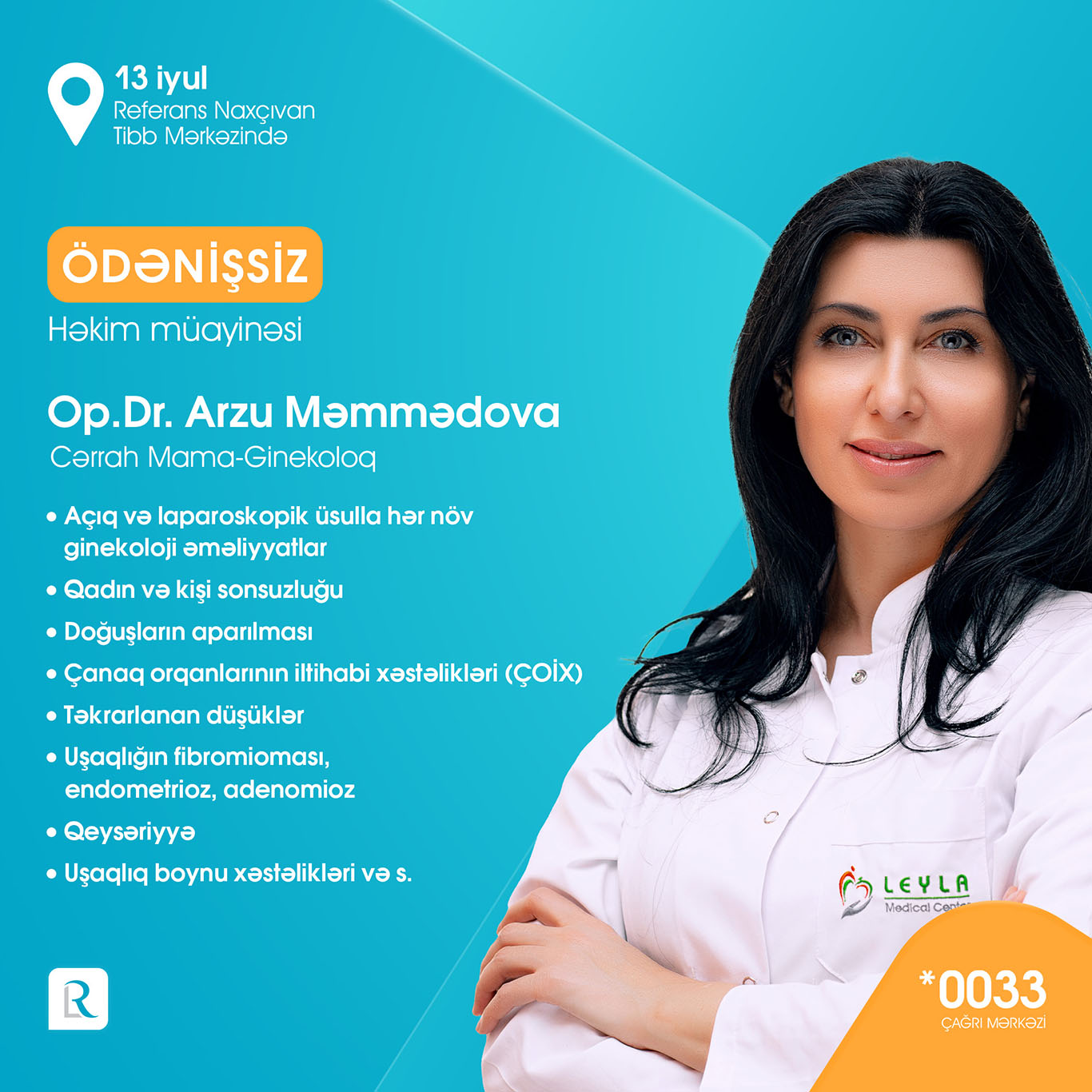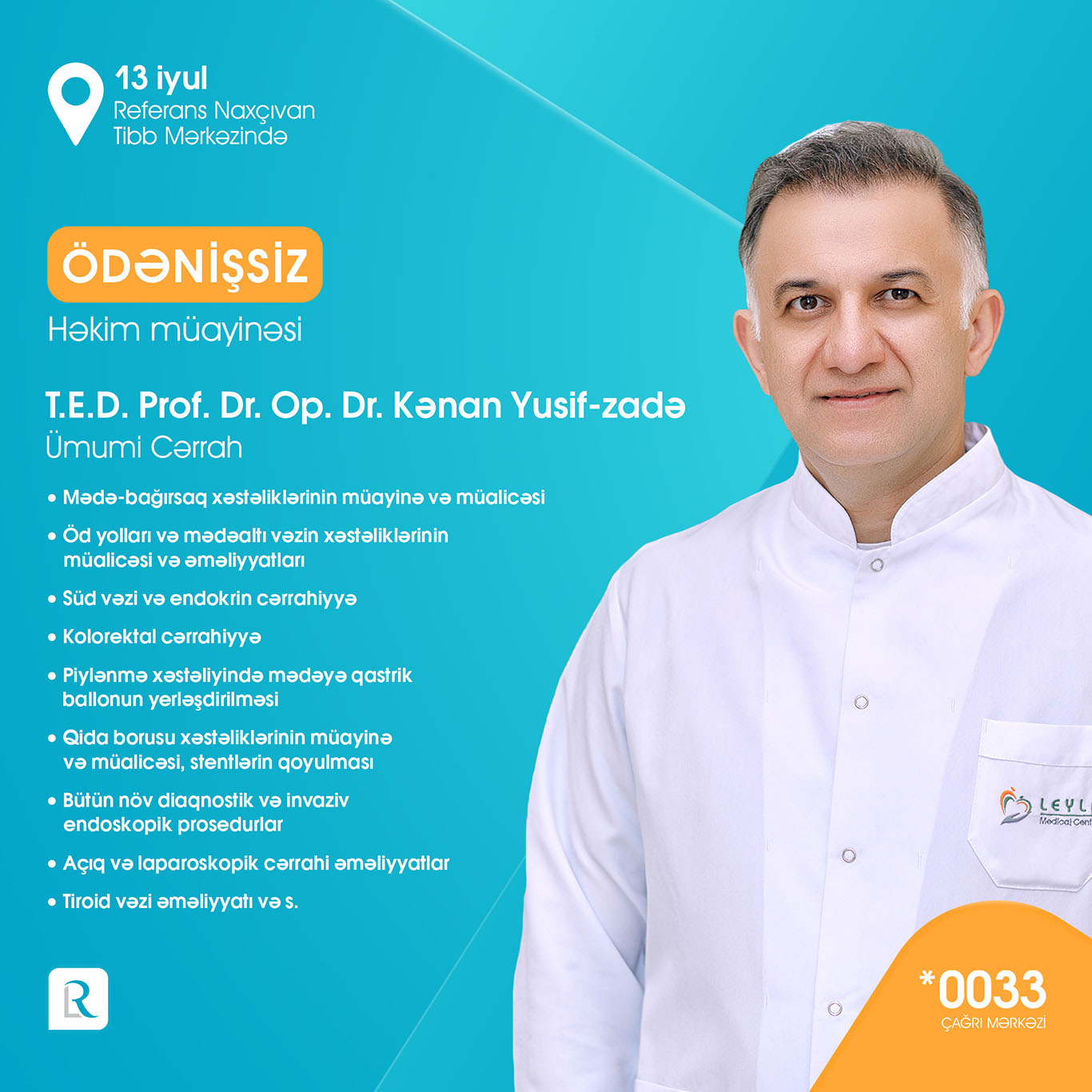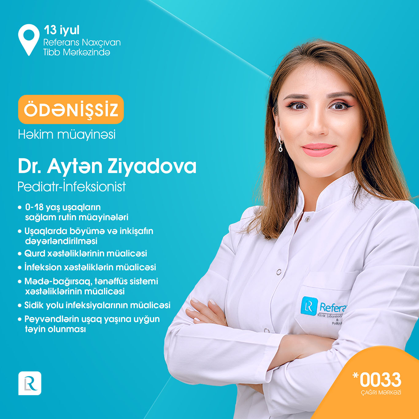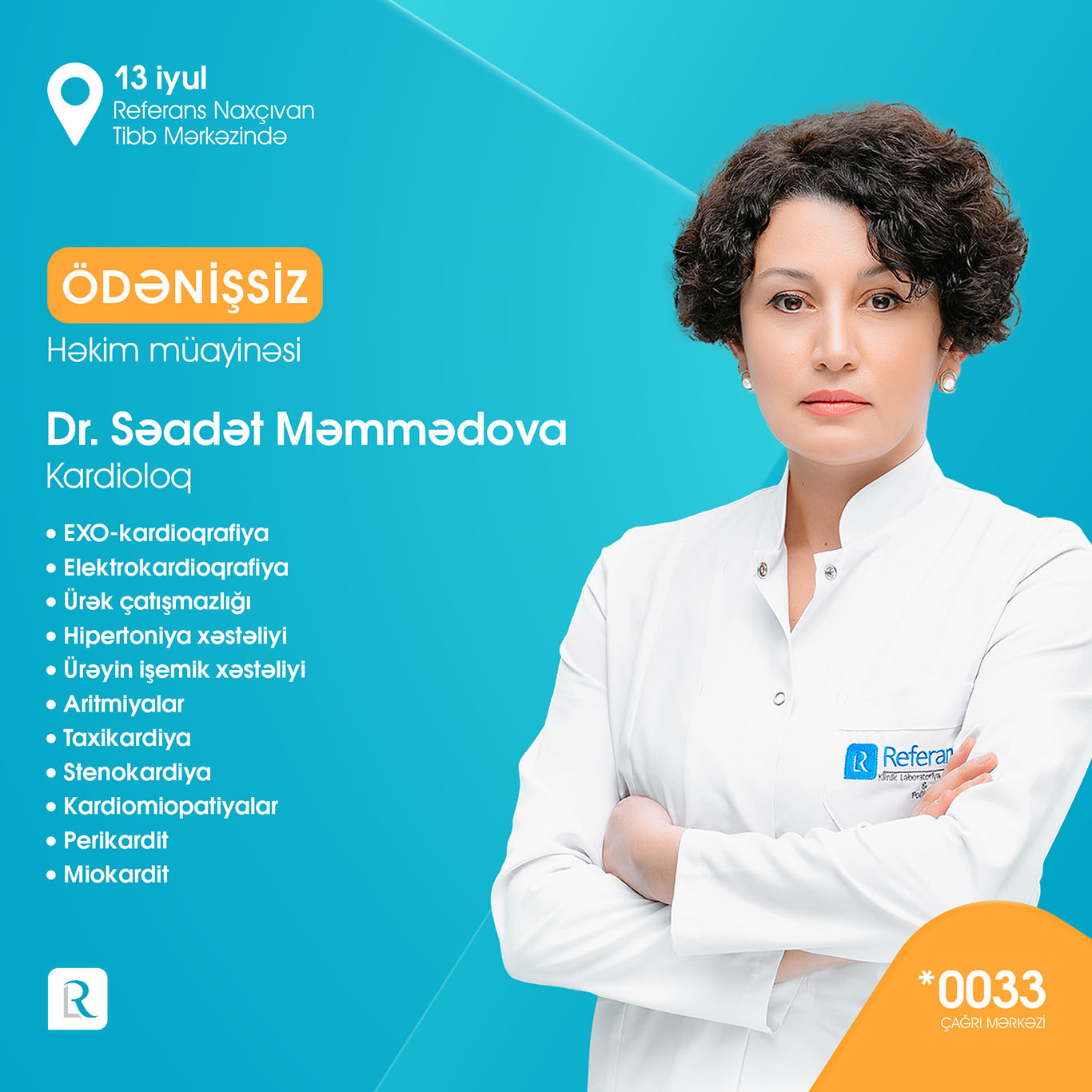 Referans Naxçıvan Tibb Mərkəzi 7000-dən çox laborator müayinələr, peşəkar həkim qəbulları, Bakıdan dəvətli həkimlər, instrumental-diaqnostik müayinələr (USM, MRT, EXO-KQ, EKQ) ilə xidmətlər göstərməkdədir. Açılışa özəl olaraq 13 iyulda Referansın Bakıdan dəvətli peşəkar həkim heyəti: ümümi cərrah-qastroentroloq professor Op. Dr. Kənan Yusif-zaadə, uşaq ürək cərrahı professor Op. Dr. Elnur Həsənov, infeksionist-hepatoloq, tibb üzrə fəlsəfə doktoru Dr. Hicran Xıdırova, daxili xəstəliklər uzmanı Dr. Həbib Sahratov, cərrah mama-ginekoloq Op. Dr. Arzu Məmmədova, pediatr-infeksionist Dr. Aytən Ziyadova, kardioloq Dr. Səadət Məmmədova usm həkimi Dr. Nigar Həmidova, cərrah mammoloq-onkoloq tibb üzrə fəlsəfə doktoru Dr. Afət Cabbarova tərəfindən ÖDƏNİŞSİZ həkim qəbulları həyata keçiriləcək.