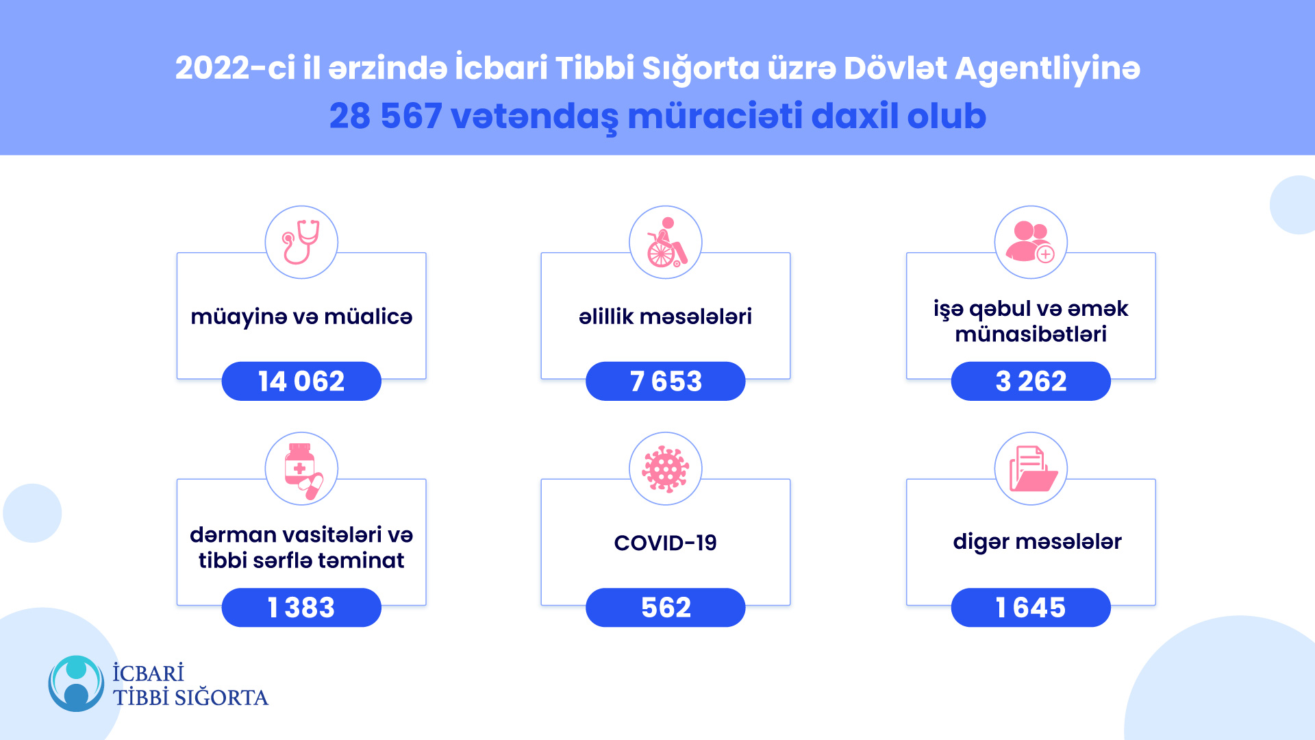 2022-ci il ərzində İcbari Tibbi Sığorta üzrə Dövlət Agentliyinə (Agentlik) ümumilikdə 28 567 vətəndaş müraciəti daxil olub. 7987 müraciət vətəndaşlar tərəfindən birbaşa olaraq Agentliyə edilib. Müvafiq dövlət qurumlarından baxılması üçün Agentliyə yönləndirilən vətəndaş müraciətlərinin sayı isə 20 580 təşkil edib. Müraciətlər əsasən Bakı, Sumqayıt şəhərləri, Şəki, Bərdə, Masallı və Cəlilabad rayonlarının sakinlərindən daxil olub.