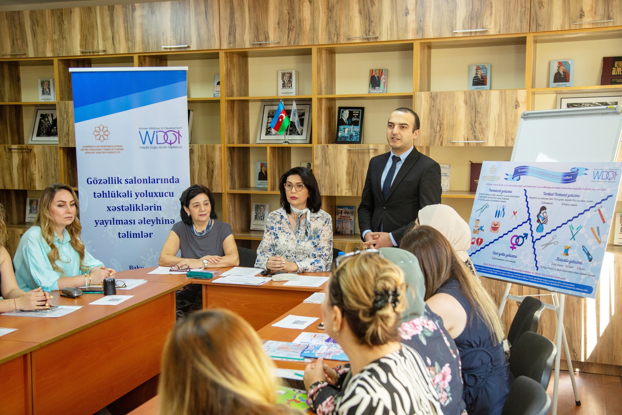 Layihə rəhbəri Ziba Nəbiyeva daha sonra  elektron təqdimat vasitəsilə xroniki  virus hepatitləri və İİV/QİÇS infeksiyaları haqqında əsas bilgiləri, ötürülmə yolları, qorunma qaydaları və profilaktik önləyici tədbirlərin əhəmiyyəti, eləcə də gözəllik salonlarında dərini zədələyə biləcək manipulyasiya alətlərinin dezinfeksiya və sterilizasiyası barədə vacib məlumatları iştirakçılara çatdırıb.