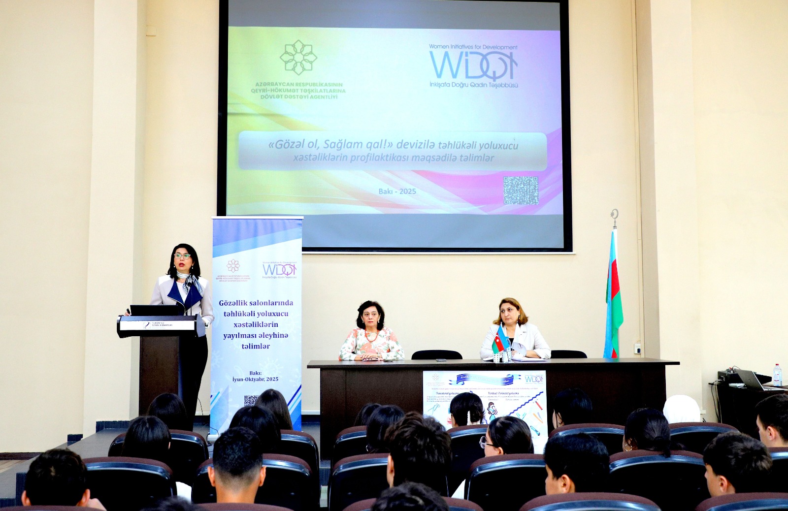 Layihə rəhbəri Ziba Nəbiyeva daha sonra elektron təqdimat vasitəsilə xroniki virus hepatitləri və İİV/QİÇS infeksiyaları haqqında əsas bilgiləri, ötürülmə yolları, qorunma üsulları, müayinə və müalicə, eləcə də gözəllik salonlarında istifadə edilən manipulyasiya alətlərinin dezinfeksiya və sterilizasiyası qaydaları barədə iştirakçılara ətraflı məlumatlar verib. Bu xəstəliklərdən qorunma yollarını təblığ edən animasiya çarxları nümayiş olunub.