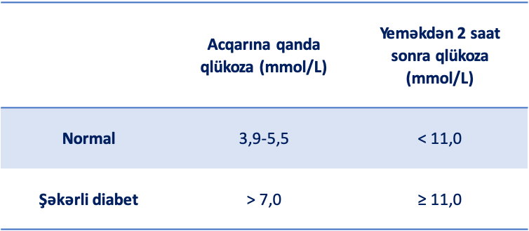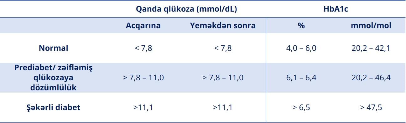 Əgər sizdə ümumi simptomlar yoxdursa, lakin qanınızda və sidikdə şəkərin miqdarı yüksəkdirsə, HbA1c səviyyələrini ölçmək üçün əlavə qan testi götürülə bilər. HbA1c 3 ay ərzində sizin qanınızda şəkərin nəcə idarə olunduğunun ölçüsünü göstərir. O, sizin qanınızda şəkərin miqdarının nə dərəcədə yüksək, aşağı və ya orta səviyyədə olduğu barədə yaxşı məlumat verir. Bu diaqramda normal və şəkərli diabet göstəriciləri barədə məlumat verilir: